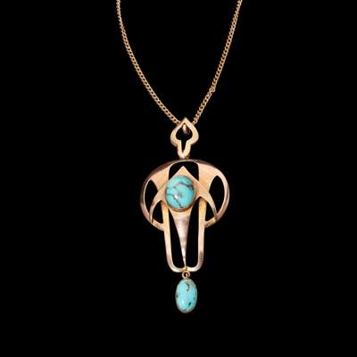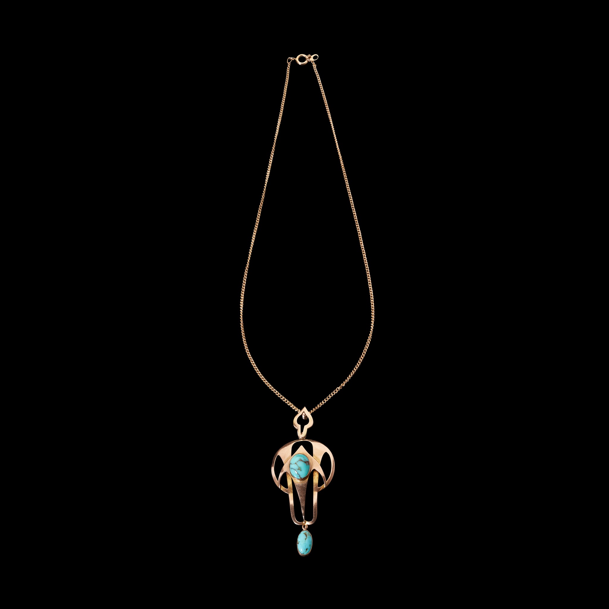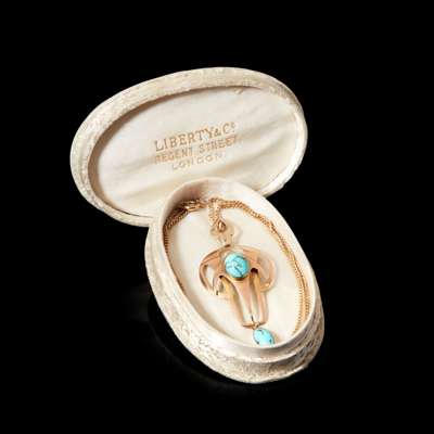 9-carat gold, set with turquoise cabochons, marked verso 9ct, later chain, with maker's mark, and contained within Liberty & Co. box