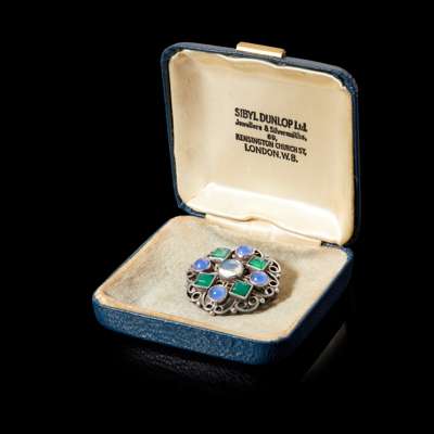 silver, set with amethysts, green chrysoprase and central moonstone cabochon, bears maker's marks verso S.DUNLOP/ SILVER, within the original box with maker's mark SIBYL DUNLOP LTD, 69 KENSINGTON CHURCH ST., LONDON W8