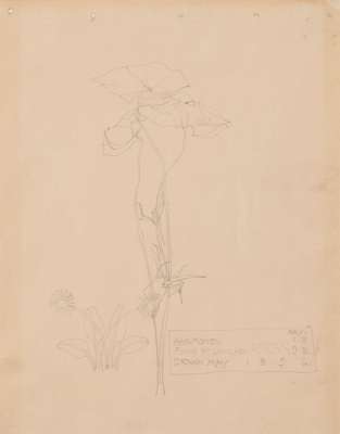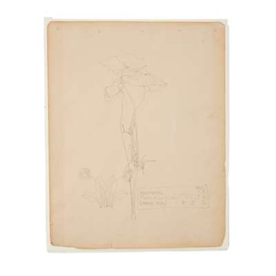 Note: Mackintosh began creating flower sketches as far back as his student days in the 1880s. ‘Anemones’ is one such early example. He notes in the cartouche that the plant was found at Lamlash on Arran in 1893, presumably pressed, and then sketched three years later in 1896. These trips and the company he kept (recorded by the inclusion of his friend’s initials in many cases) were clearly important to him. The sketches represent a journal of sorts, and it perhaps speaks to a sensitivity (as well as his great precision) that he chose to depict a re-discovered flower from a past excursion.