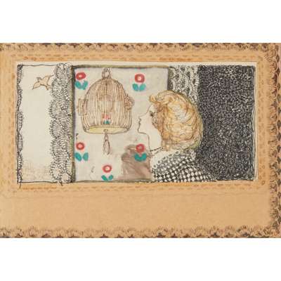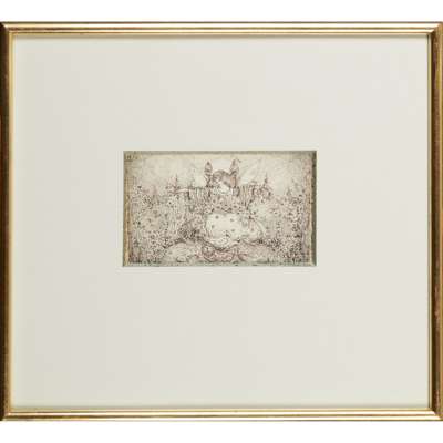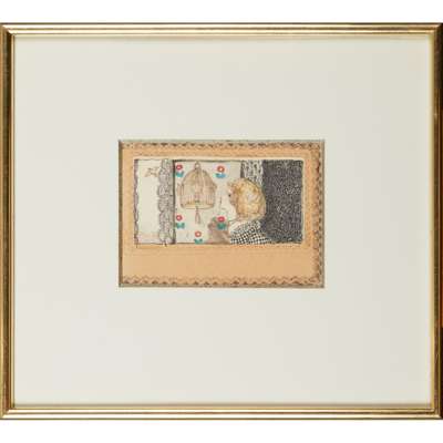 pen & ink, later framed 8cm x 13cm (frame 28.3cm x 31cm); together with THE BIRDCAGE, pen & ink, watercolour, later framed, 6.5cm x 12cm (frame 28.5cm x 31cm)