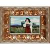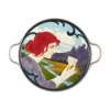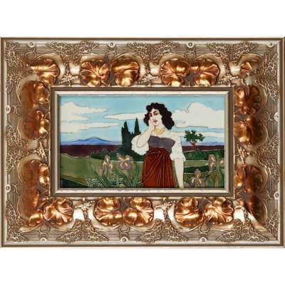 glazed earthenware, with patinated metal mount, painted VII, impressed number 5094, 40cm across (including handles); together with a JUGENDSTIL FRAMED TILE, CIRCA 1900, by the same hand, glazed earthenware, framed, 15cm x 26cm (frame 35cm x 46cm)