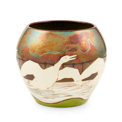 Note: The Zsolnay factory rose to prominence after the 1867 formation of the Austro-Hungarian Empire ended political unrest in Hungary. Austrian design had a strong impact on the factory and its ‘eosin’ lustre glaze, developed in the 1870s, provides the curving outlines of its wares with a sensual metallic sheen.