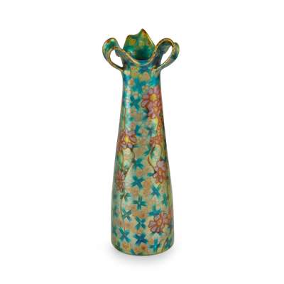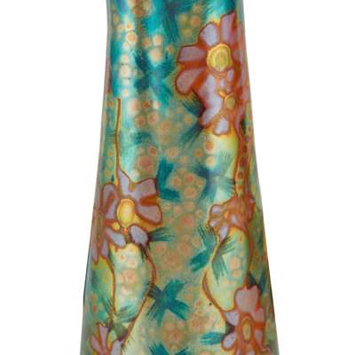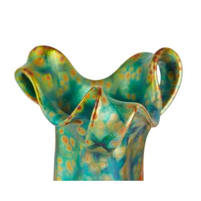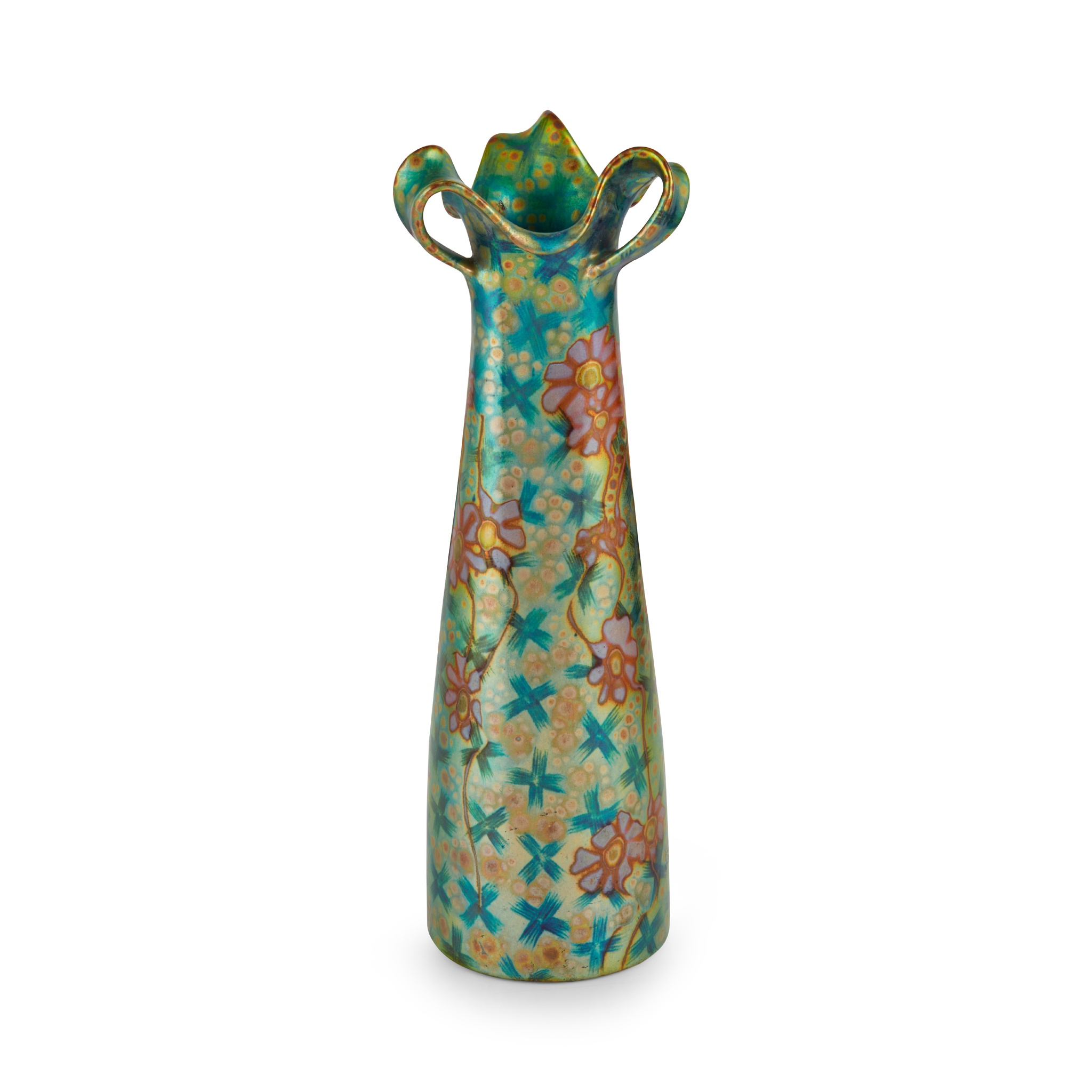 Note: The Zsolnay factory rose to prominence after the 1867 formation of the Austro-Hungarian Empire ended political unrest in Hungary. Austrian design had a strong impact on the factory and its ‘eosin’ lustre glaze, developed in the 1870s, provides the curving outlines of its wares with a sensual metallic sheen.
