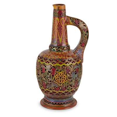 Note: The Zsolnay factory rose to prominence after the 1867 formation of the Austro-Hungarian Empire ended political unrest in Hungary. Austrian design had a strong impact on the factory and its ‘eosin’ lustre glaze, developed in the 1870s, provides the curving outlines of its wares with a sensual metallic sheen.