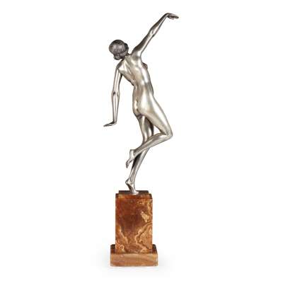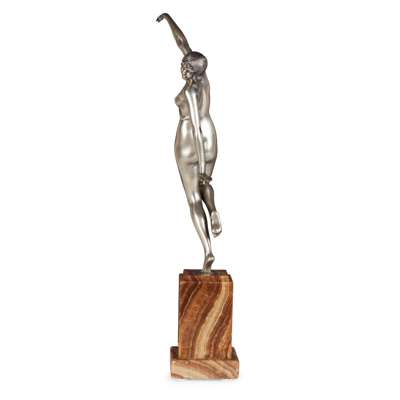 silvered bronze on marble base, stamped BRONZE to the foot, engraved CHIPARUS/ ETLING PARIS' to the marble base