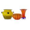 glass, comprising a SMALL LOBED VASE, 6cm high; a VASE, with black applied knops and ribbing, 11.5cm high; and a SMALL TRUMPET VASE, 11cm high