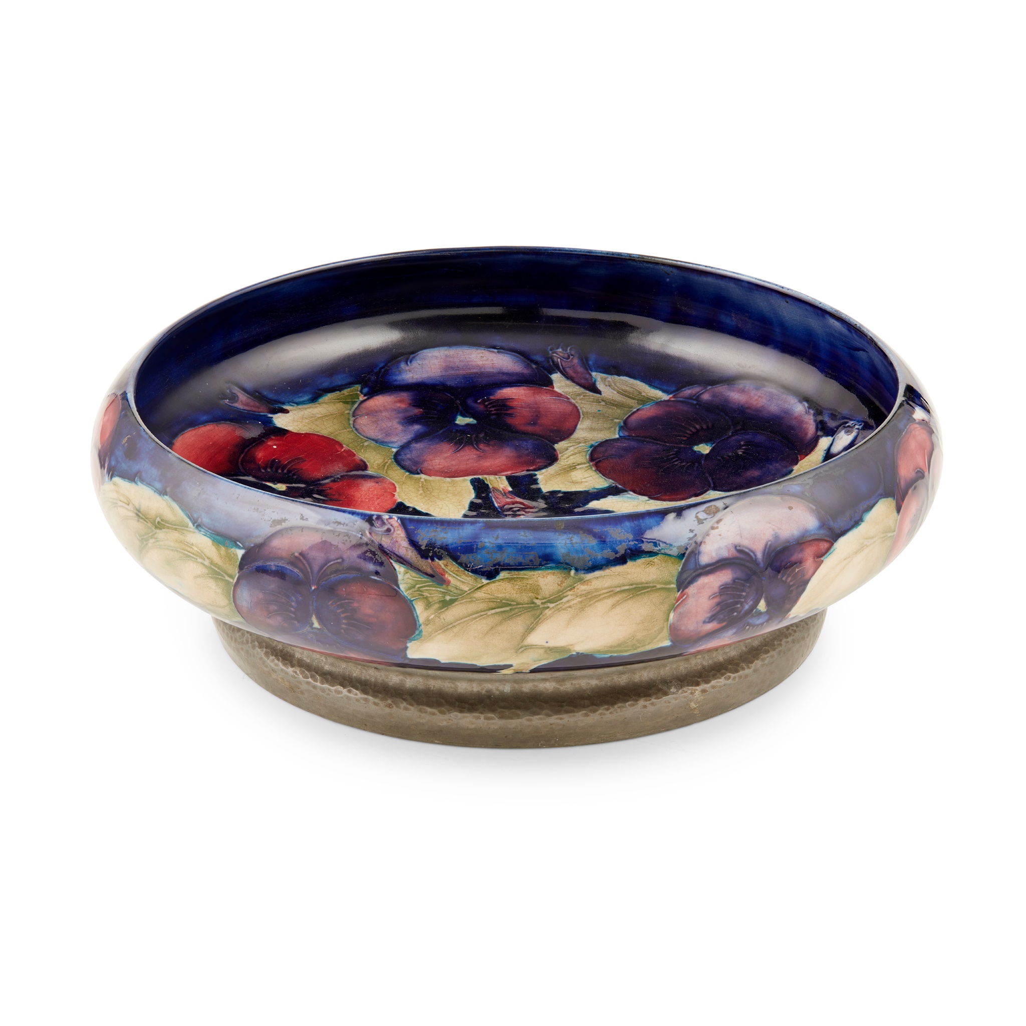 pewter-mounted glazed earthenware, stamped TUDRIC/ MOORCROFT/ MADE IN ENGLAND/ H/ 01311, 25cm diameter; together with a 'POMEGRANATE' FOOTED BOWL, glazed earthenware, green painted signature, impressed MOORCROFT/ BURSLEM, 28.5cm diameter