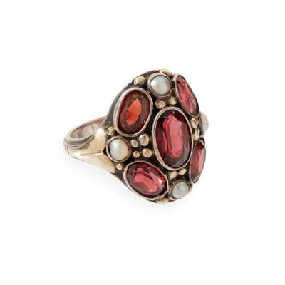 silver, set with garnets and seed pearls, stamped B.I./ SILVER