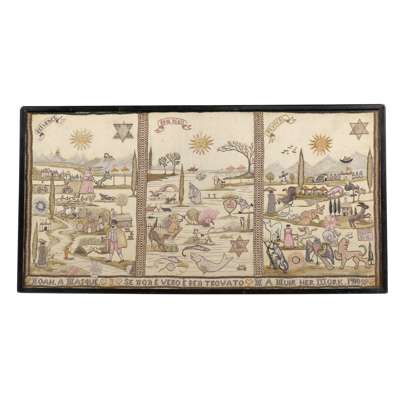 worked by M.A. Muir, with three panels depicting animals and figures in a landscape and bearing inscriptions DEFIANCE/ DOWNFALL/ REVIVAL and to the base NOAH, A MASQUE/ SE NON E VERO E BEN TROVATO/ M A MUIR (Marion Muir) HER WORK 1910, framed and glazed