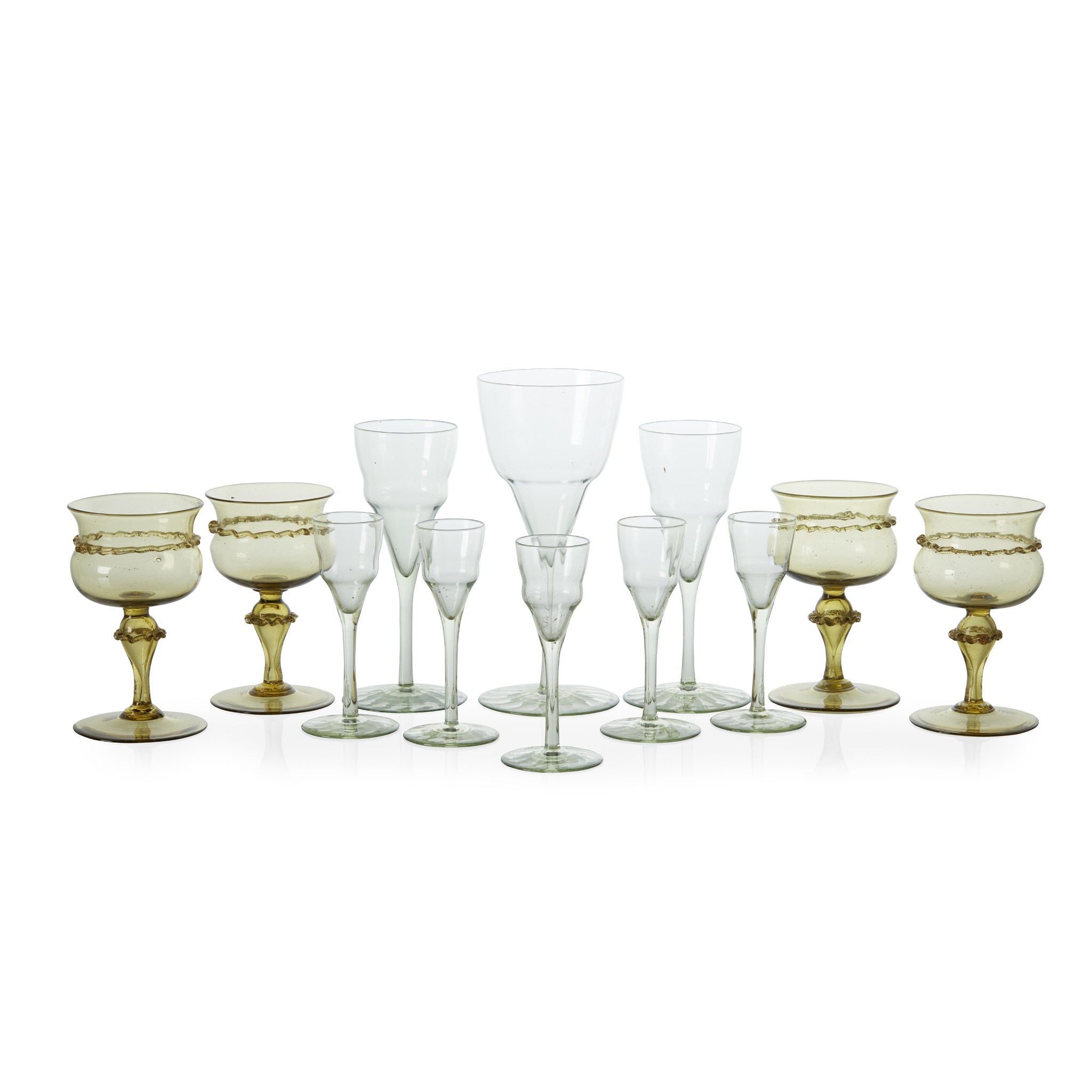 green glass, comprising a red wine glass, 16cm high, a pair of white wine glasses, 13.5cm high; and five liqueur glasses, 10cm high; also a SET OF FOUR WINE GLASSES, attributed to James Powell & Sons, amber glass, each with applied decoration, 10.5cm high