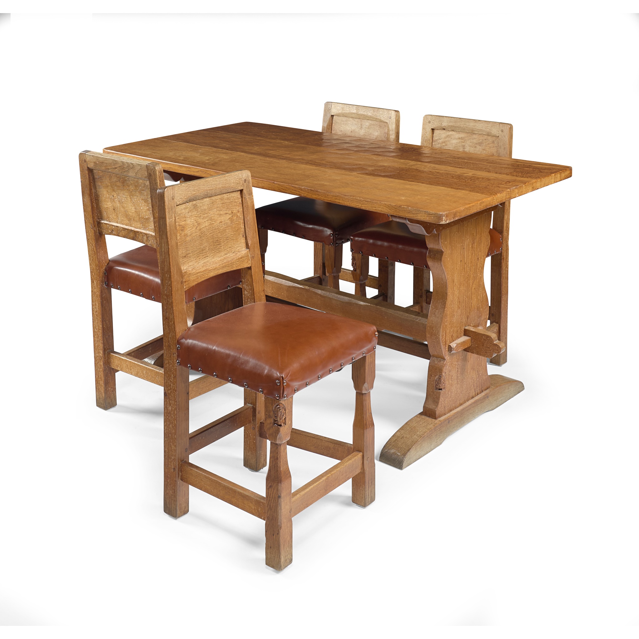 oak, close-nailed upholstery, each bears carved gnome signatures, comprising a DINING TABLE, 137cm long, 76cm high, 75cm deep; and a SET OF FOUR CHAIRS, each 39cm wide, 83cm high, 39cm deep