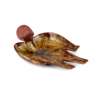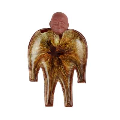 Note: The unusual shape of this vessel is included among the advertisements for Linthorpe Pottery in the Furniture Gazette, 22 May, 1880. The dish is based on a Fijian yaqona dish, a priest’s ritual drinking vessel, and named after the narcotic drink used in the ritual. Dresser is likely to have been familiar with the yaqona dish in the form of a male figure acquired by the British Museum in 1842 (1842. 12-10.127).