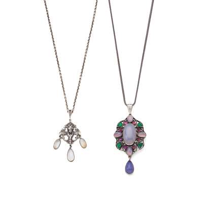 silver, set with cabochons of blue chalcedony, green chalcedony and garnets, stamped maker's mark SD, hallmarked London 1961, pendant including bale 7cm long, length of later chain 42cm; together with another ARTS & CRAFTS PENDANT, silver with moonstone drops, pendant 5cm long, 43cm long including chain (2)