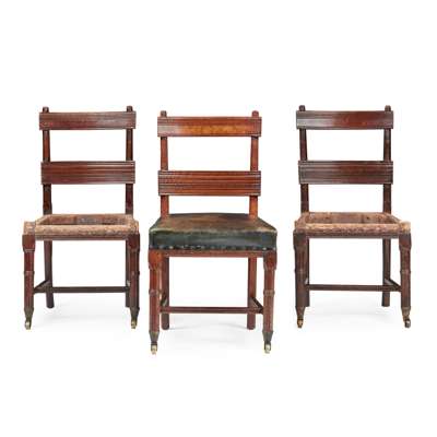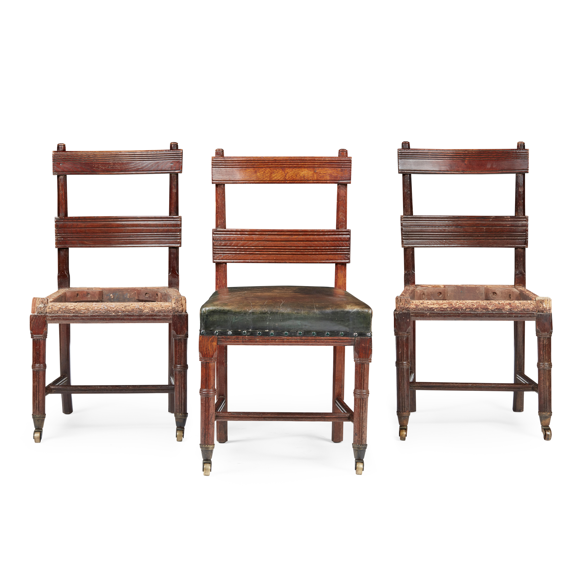 oak, one with original close-nailed leather upholstered seat, branded marks to two of the three chairs (3)