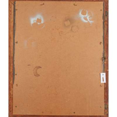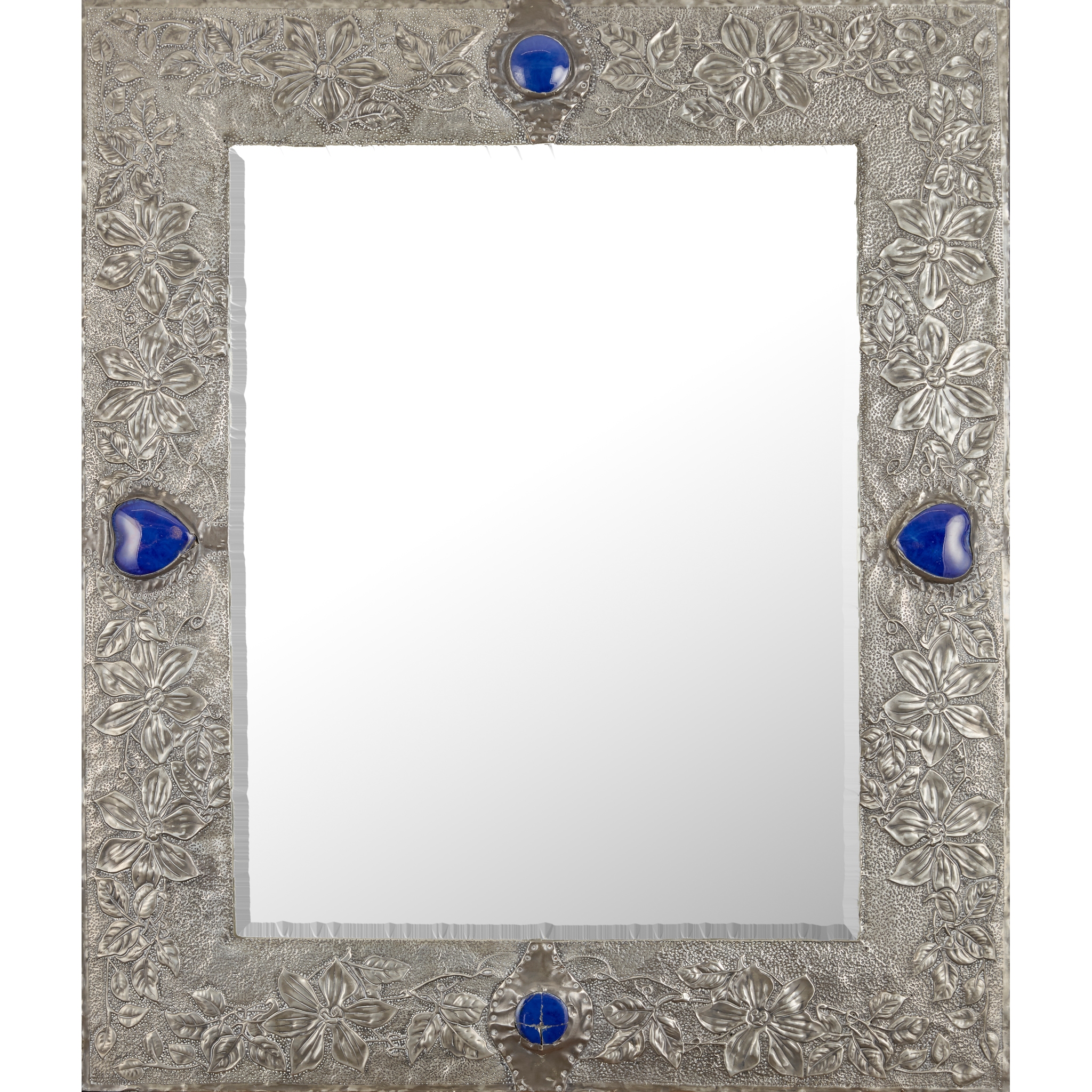 repoussé-decorated tin, set with glazed ceramic panels, bevelled mirror plate