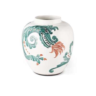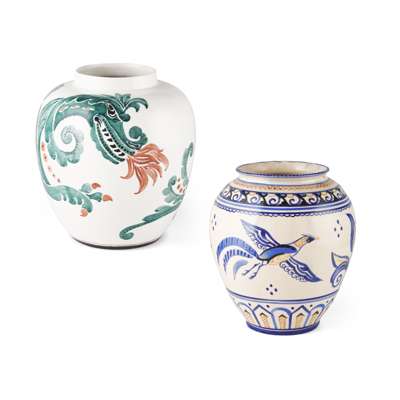 painted and glazed earthenware, painted maker's marks, 22cm high; together with a GINGER JAR BY CATHERINE BLAIR (1872-1946) FOR MAK' MERRY POTTERY, DATED 1928, painted and glazed earthenware, painted maker's marks, artist's initials and dated 1928, 22.5cm high (2)