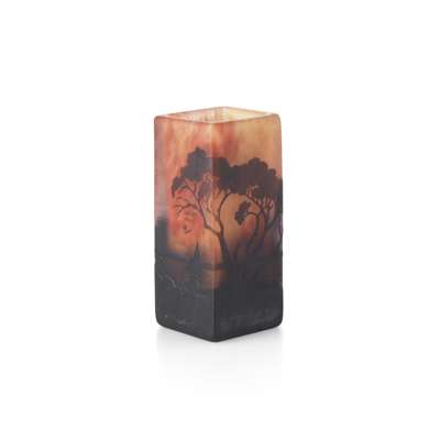 comprising ‘Monnaie du Pape’, the mottled orange glass acid etched, signed DAUM/ NANCY with Cross of Lorraine, 12cm high; together with DAUM, NANCY CAMEO GLASS VASE, CIRCA 1910, mottled orange glass acid etched, signed DAUM/ NANCY with the Cross of Lorraine, 12cm high (2)