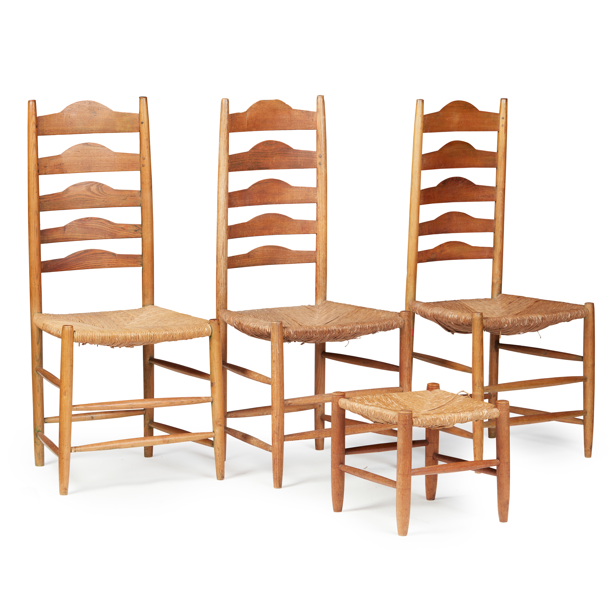 elm with rush seats, 46cm wide, 106cm high, 42cm deep, together with an ARTS & CRAFTS STOOL, oak with rush seat, 34cm square, 33cm high (4)
