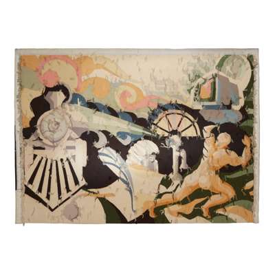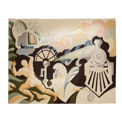 Note: This tapestry was designed for Dunedin Fund Managers Ltd. by James More, Managing Director of the Edinburgh Tapestry Company in July 1987. It depicts various subjects (noted below) connected with the history of the investment industry together with the Dunedin logo. The subjects include a quill pen, an inkwell & a judge's wig; the fanlight of a Victorian doorway; an upright telephone; a 19th-century American locomotive; a piece of engineering equipment; Sisyphus, a character from Greek mythology endlessly pushing the stone uphill.