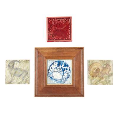glazed ceramic, depicting a mountain goat and a squirrel, on Wedgwood blanks, 15.4cm square; a MINTON ART POTTERY STUDIO TILE, depicting a crab and a serpent, framed, impressed and printed maker's mark, tile 15cm square; and a J C EDWARDS TILE TEAPOT STAND BY C.F.A. VOYSEY, moulded maker's mark, 16cm square (4)