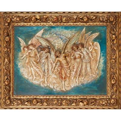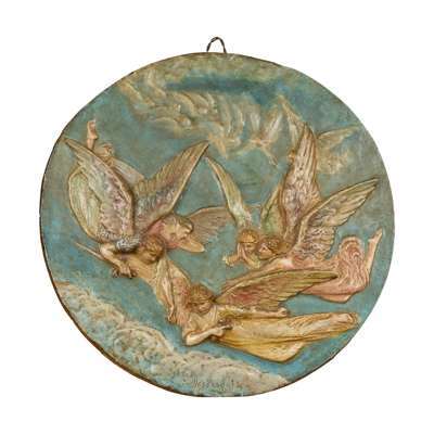 polychrome terracotta, framed, signed and dated lower right E. HALSE/ 1917 framed, 42cm x 56cm (frame size 59cm x 73.5cm); together with ‘MESSENGERS’, RELIEF ROUNDEL, CIRCA 1910, polychrome terracotta, signed E. HALSE, 42cm diameter (2)