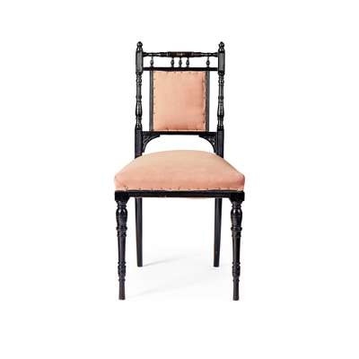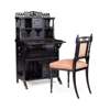 ebonised wood, with writing slide inset with tooled leather skiver, brass fittings, 64.5cm wide, 119.5cm high, 45cm deep (closed); together with an associated ENGLISH AESTHETIC MOVEMENT CHAIR, ebonised wood, upholstery, 44cm wide, 86cm high, 46cm deep (2)