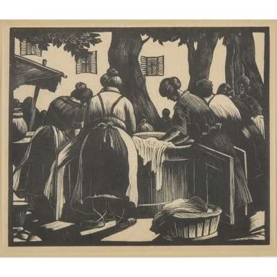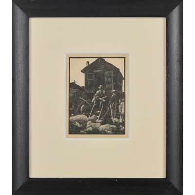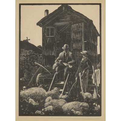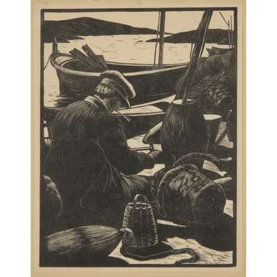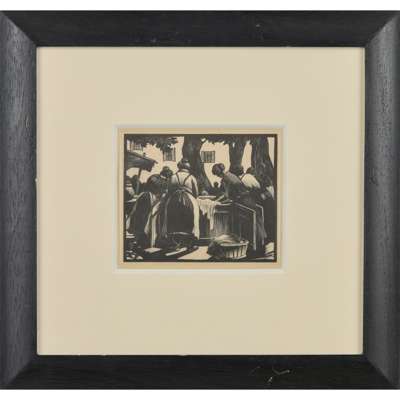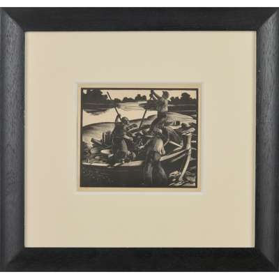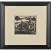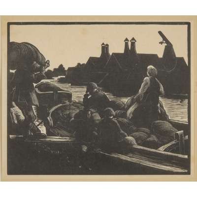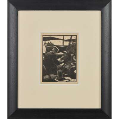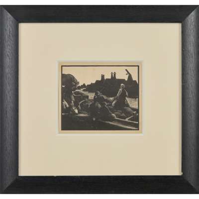 comprising; ‘Mending the Nets’, 18cm x 13cm (frame size 42cm x 36.5cm); ‘Lambing’, 18cm x 13.5cm (frame size 42cm x 36.5cm); ‘Barges’, 14.5cm x 16.5cm (frame size 38.5cm x 40cm); ‘Washerwomen’, 14cm x 16cm (frame size 38cm x 40cm; and ‘Breaking up the Barges’, 16.5cm x 18.5cm (frame size 40.5cm x 42.5cm) (5)