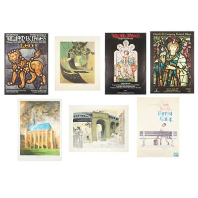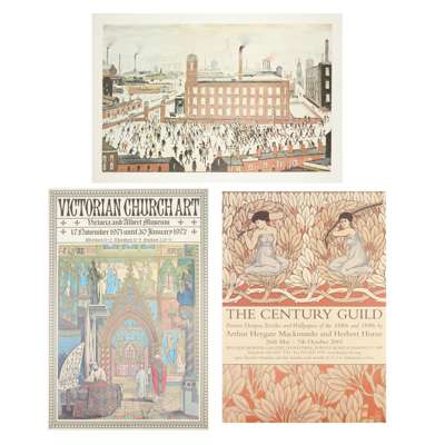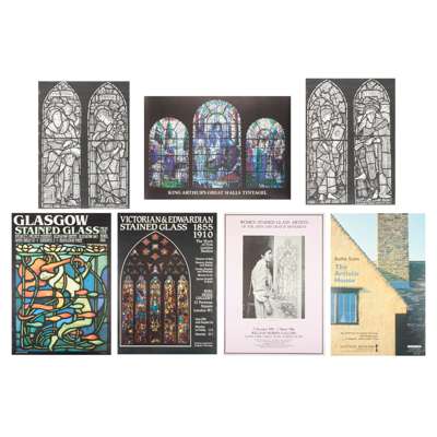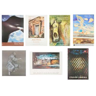 comprising; VICTORIAN CHURCH ART, Victoria and Albert Museum, 1972, 73.5cm x 48cm; HENRY HOLIDAY, William Morris Gallery, 59cm x 42cm (2); MORRIS & COMPANY TILES, William Morris Gallery, 1996-7, 59.5cm x 42cm; THE STRANGE GENIUS OF WILLIAM BURGES, Victorian and Albert Museum, 1981-2, 76cm x 50cm; THE HOLY GRAIL TAPESTRIES, City Museum and Art Gallery Birmingham, 1985, 76cm x 51cm; MORRIS & COMPANY STAINED GLASS, William Morris Gallery, 1996, 59.5cm x 42cm; THE STRANGE GENIUS OF WILLIAM BURGES, National Museum of Wales, 1981, 59cm x 42cm; WILLIAM BURGES, DESIGNS FOR CARDIFF CASTLE, Geffrye Museum, 1981, 76cm x 50.5cm; JOHN PIPER, at Renishaw Hall, 2000, 59cm x 42cm; HENRY MOORE, in Bretton Country Park, 1994-5, 70cm x 49.5cm; JOHN PIPER, at Renishaw Hall, 1997, 42cm x 59cm; PAUL NASH, AERIAL CREATURES, Imperial War Museum, 1997, 76cm x 51cm; THE DRAWINGS OF HENRY MOORE, Tate Gallery, 1978, 76cm x 51cm; GLASGOW STAINED GLASS, People's Palace Museum, 1981, 59.5cm x 42cm; THE CENTURY GUILD, William Morris Gallery, 2001, 59cm x 42cm; VICTORIAN AND EDWARDIAN STAINED GLASS, RIBA Heinz Gallery, 60cm x 42cm; WOMEN STAINED GLASS ARTISTS OF THE ARTS & CRAFTS MOVEMENT, William Morris Gallery, 1986, 68.5cm x 49cm; BAILLIE-SCOTT, THE ARTISTIC HOUSE, Geffrye Museum, 1996, 76cm x 51cm; THE NEW AMERICAN WING, Metropolitan Museum of Art, 101.5cm x 61cm; KING ARTHUR'S GREAT HALLS, Tintagel, 42cm x 59cm; COVENTRY CATHEDRAL, 76cm x 51cm; ST MICHAEL, ST GABRIEL, 65cm x 99cm; L.S. LOWRY, print, Industrial Scene, 58.5cm x 86cm; GRAHAM SUTHERLAND, print, Entrance to a Lane, 74cm x 61.5cm; RICHARD BAWDEN, print, 55cm x 70cm; JOHN PIPER, print, Exeter College Chapel, Oxford, 69.5cm x 49.5cm; TOM HANKS IS FORREST GUMP, poster, 84cm x 59cm (27) sold as seen, not subject to return