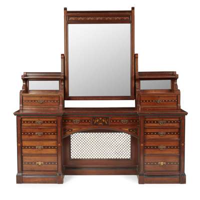 walnut, with marquetry inlay and ebonised decoration, brass fittings, comprising; WARDROBE, bears paper maker's label verso MARSH, JONES & CRIBB (LATE KENDELL & CO. NO. 63332, workman's name GODSELL), 245cm wide, 251.5cm high, 65cm deep; DRESSING CHEST, 180.5cm wide, 76.5cm high, with mirror 190cm high, 51cm deep; CHEST OF DRAWERS 121.5cm wide, 130cm high, 58cm deep; BED, includes a button upholstered chintz headboard, 170cm wide, 157cm high, 211cm long; POT CUPBOARD, label verso MARSH, JONES & CRIBB (LATE KENDELL & CO. NO. 63336, workman's name EARNEST LANE) 43.5cm wide, 83.5cm high, 40cm deep (5)