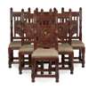 carved oak with marquetry inlaid panels of the dove of peace and upholstered seats, each stamped GILLOWS (6)