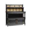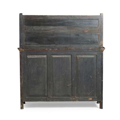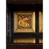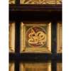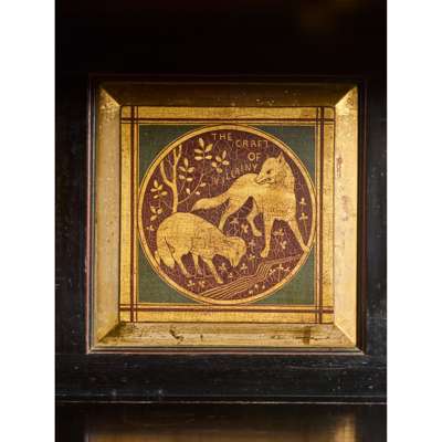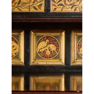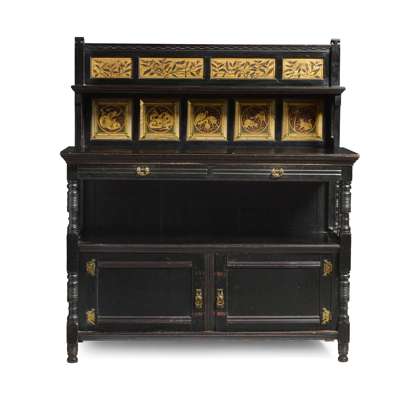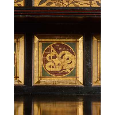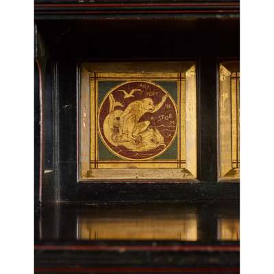 ebonised wood, with red painted decoration, and brass fittings, the upstand inset with gilt and polychrome panels, some depicting Aesop's fables, possibly by John Moyr Smith