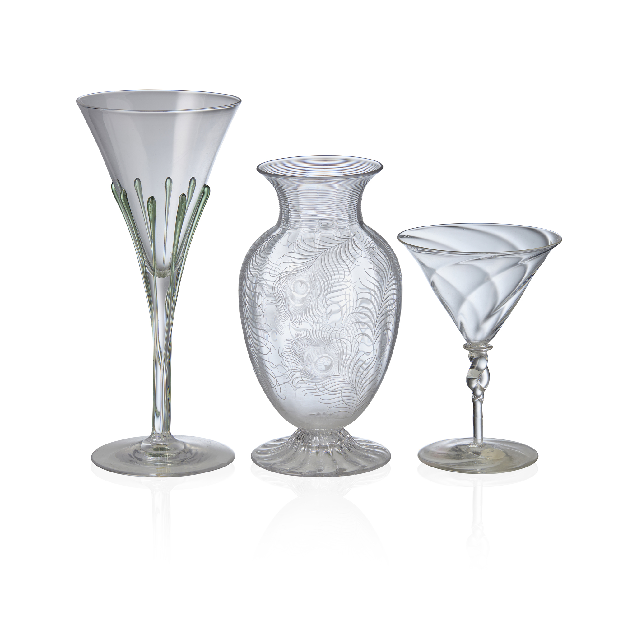 comprising; a ‘TEAR’ WINE GLASS, CIRCA 1899, attributed to Harry Powell, 20.5cm high; a WINE GLASS, CIRCA 1860, attributed to Philip Webb, 12.5cm high; together with a small VASE, CIRCA 1880, 17.5cm high (3)