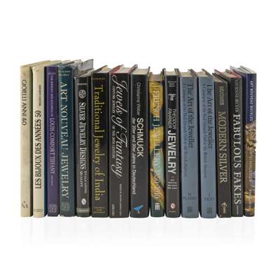 comprising; a collection of reference books for 19th and 20th century jewellery and silver to include; Becker, Vivienne, ART NOUVEAU JEWELLERY, Thames and Hudson 1985; Farnettie, Deanna (ed.), JEWELS OF FANTASY; COSTUME JEWELLERY OF THE TWENTIETH CENTURY, Harry N Abrams, 1992; Dormer, Peter and Turner, Ralph, THE NEW JEWELERY, Thames & Hudson, 1994; Drutt, Helen W. and Dormer, Peter, JEWELERY OF OUR TIME; ART, ORNAMENT & OBSESSION, Thames & Hudson, 1995; Hughes, Graham, MODERN JEWELERY, Studio Vista, 1968; Hughes, Graham, MODERN SILVER, Crown, 1967 etc.; together with a collection of exhibition, museum and auction catalogues to include; Tate, Hugh (ed.) THE ART OF THE JEWELLER, A CATALOGUE OF THE HULL GRUNDY GIFT TO THE BRITISH MUSEUM, British Museums Publications Limited, 1984; RECENT ACQUISITIONS BY THE GOLDSMITH'S COMPANY, 1975-1985; Goldsmith's Hall London; LOOT, Minneapolis Catalogue, Minneapolis Institute of Art, July 14-30 1978; Rutherford, Jessica and Beddoe, Stella, ART NOUVEAU, ART DECO AND THE THIRTIES; THE CERAMIC, GLASS AND METALWORK COLLECTIONS AT BRIGHTON MUSEUM, The Royal Pavilion, Art Gallery and Museums, Brighton, 1986; FINE JEWELS AND WATCHES FROM THE ATELIER OF LEON HATOT, Christie's Geneva, May 10 1989 etc. (qty)