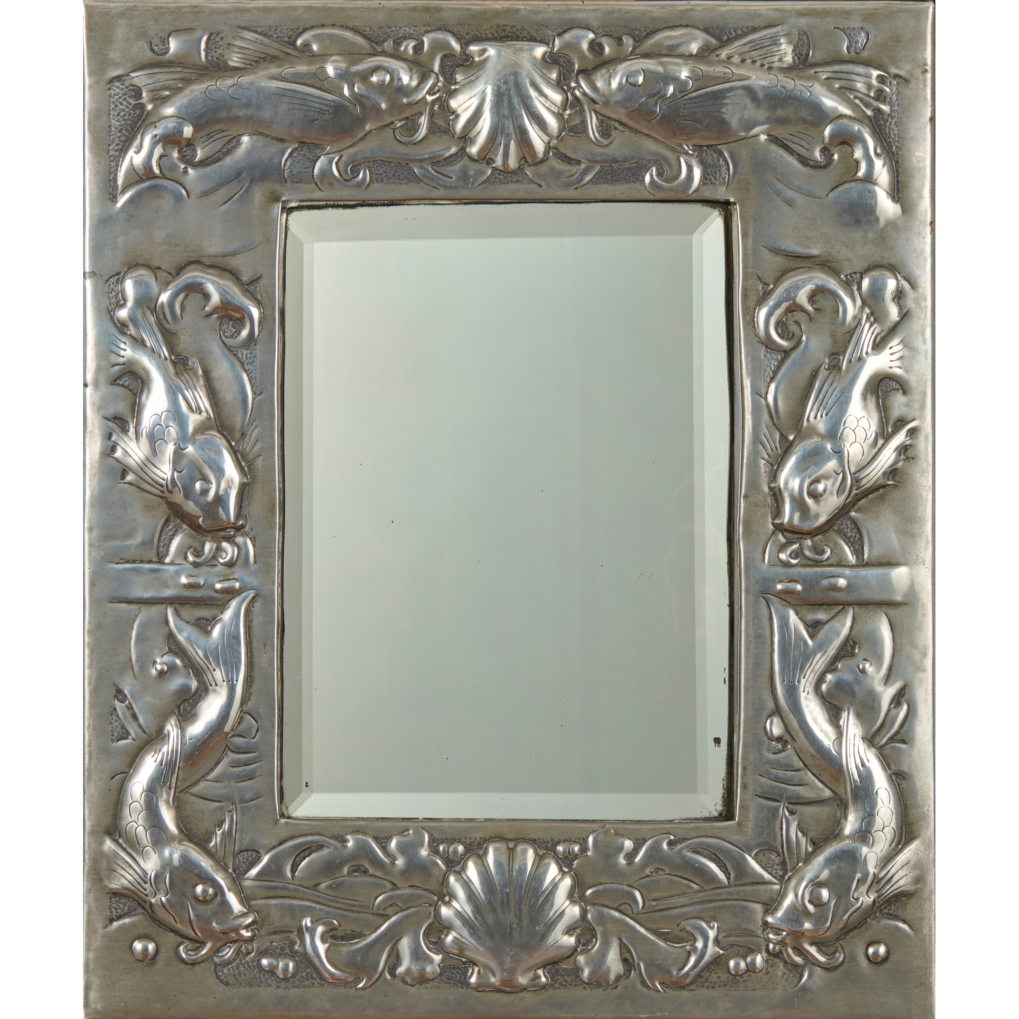 repoussé-decorated metal, bevelled mirror plate