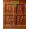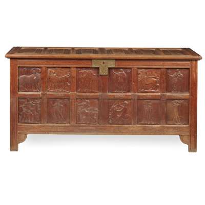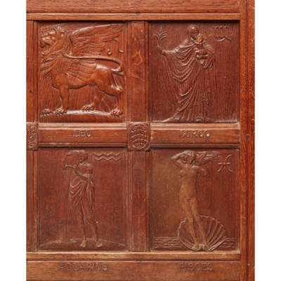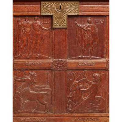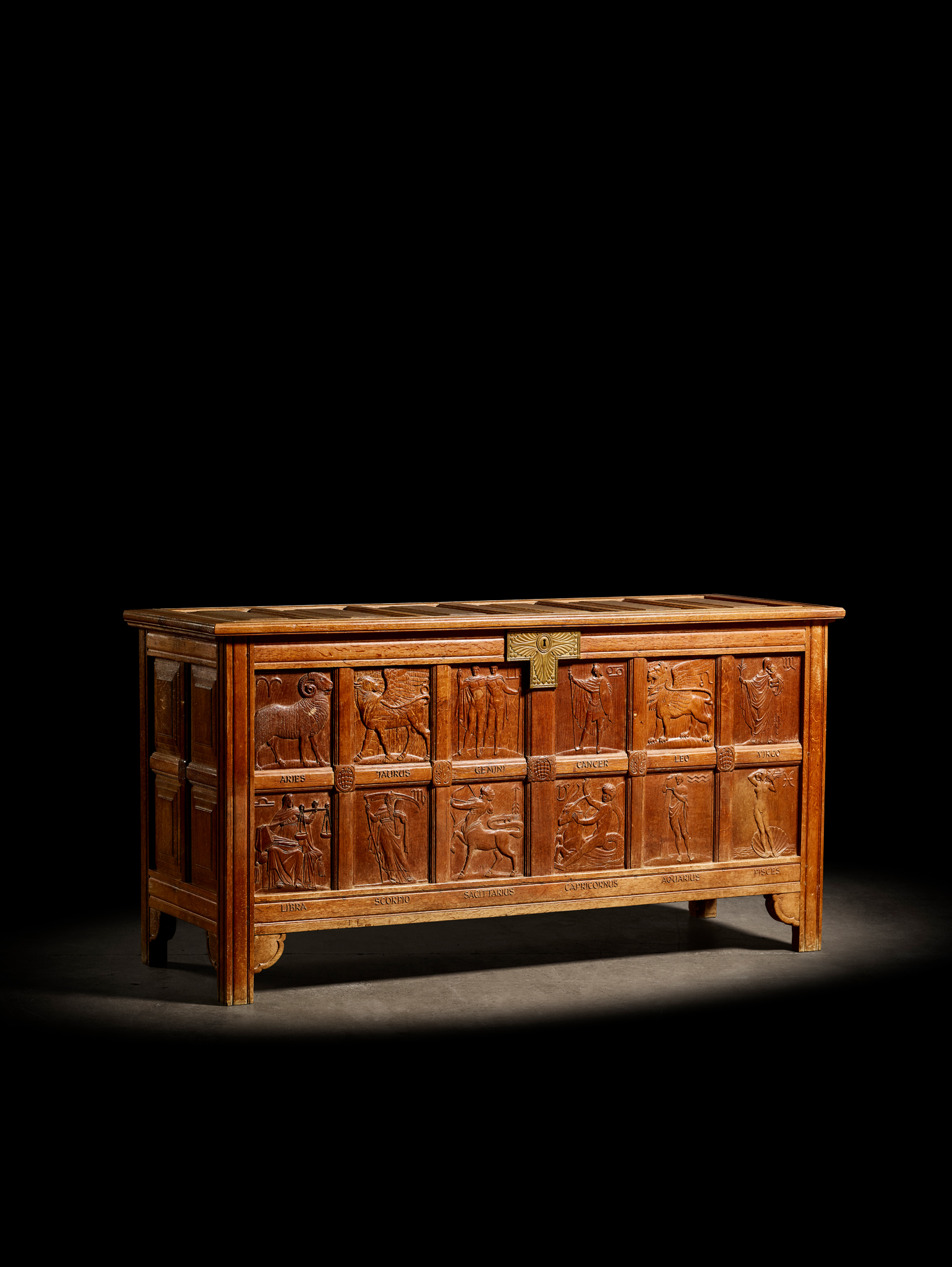 Note: The Arts & Crafts designer Henry Wilson trained initially as an architect under J. D. Sedding (1838-1891), who had himself been apprenticed to the leading Gothic revival architect George Edmund Street (1824-1881). Wilson continued his architectural commissions as his career progressed, but worked increasingly in metalwork, sculpture and jewellery. The Zodiac chest was illustrated in the Studio Magazine, Vol 86, 1923, and the relief carved panels are said to foreshadow the more sculptural bronzes Wilson designed in the final decade before his death in 1934.