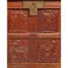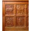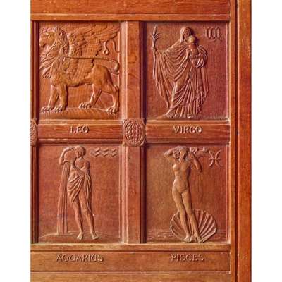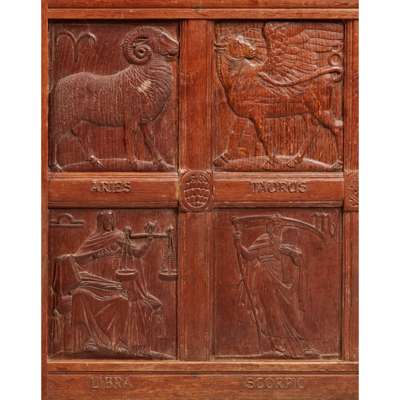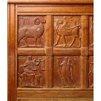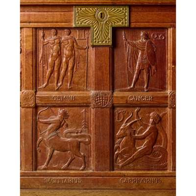 oak, with twelve relief carved Zodiac panels, each with inscription, cast brass lock plate