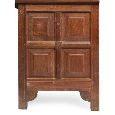 When Wilson first came to Norton-sub-Hamdon Micklewright was manager of the Charles Trask & Sons workshop, but by the 1920’s he owned and ran the premises. A surviving W. E. Micklewright catalogue illustrates items including the zodiac chest, a clock, cabinet and bed. According to the account of Mr Reg. Sweet, an apprentice in the workshop from 1923-25, the business employed at least eight craftsmen carrying out work predominantly in oak and of a religious nature. Sweet recalls Micklewright’s perfectionist tendencies but lack of business sense, the latter a factor presumably behind the workshop’s premature closure in 1925. The current lot was purchased at this time and, until now, has not left Norton-sub-Hamdon.