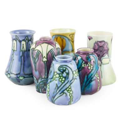 relief moulded and glazed earthenware comprising; a VASE, painted maker's mark and shape MINTONS LTD/ NO 17, 13cm high; TWO VASES, painted maker's mark and shape, MINTONS LTD/ NO 5, 10.5cm high; a VASE, painted maker's mark and shape MINTONS LTD/ NO 20, 13.5cm high; a VASE, painted maker's mark and shape MINTONS LTD/ NO 9, 13cm high; a VASE, painted maker's mark and shape MINTONS LTD/ NO 7, 13.5cm high (6)