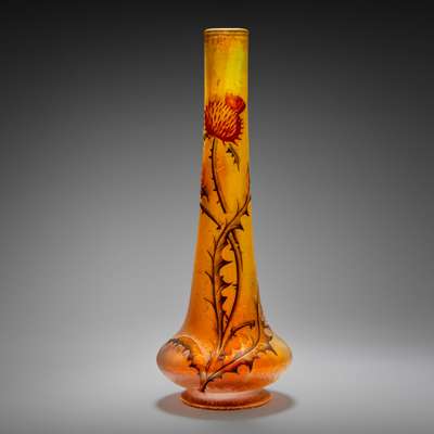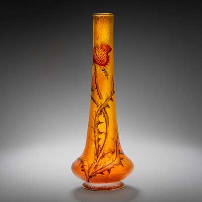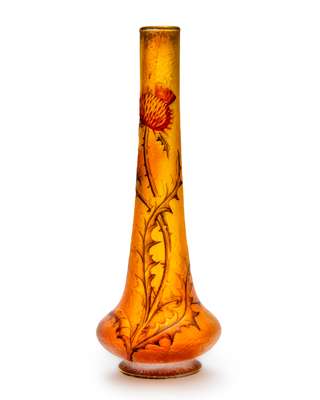 yellow glass, overlaid, acid-etched, enamelled, with gilt highlights, gilt DAUM NANCY with Cross of Lorraine