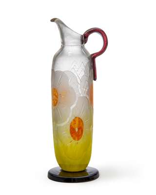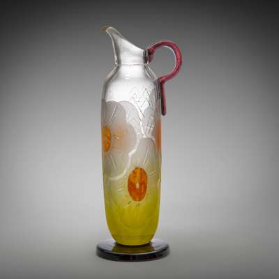 mottled and clear glass, acid-etched and engraved, with applied handle and foot, engraved LE VERRE FRANÇAIS