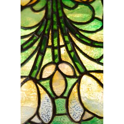 leaded glass, patinated bronze, stamped to reservoir underside with Tiffany Glass and Decorating Company monogram, further stamped TIFFANY STUDIOS/ NEW YORK, numbered D888, arms stamped T.G.&D. Co., converted to electricity