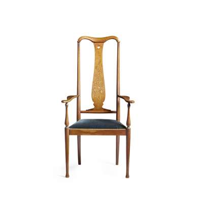 Note: Designed for the Kodak showrooms in Brussels, this elegant armchair sees Walton subvert traditional style of country seating furniture. Inspired by the form of the ‘fiddle-back’ chair, Walton elongates the back as the curved top rail meets the open arms in a manner similar to late 18th century methods of furniture construction. Later exhibited in Glasgow at the 1901 International Exhibition, the iconic ‘Brussels’ armchair exemplifies Walton’s radical approach to furniture design.