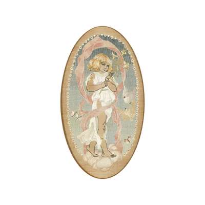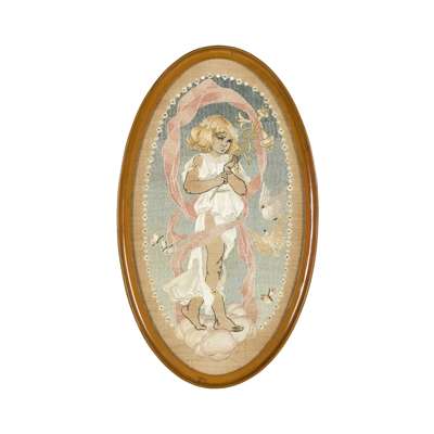 Note: Christine Angus was a British illustrator and embroiderer. Her designs were often figurative and included illustrations of children. She made several pieces for the furniture designer Ambrose Heal and was married to the painter Walter Sickert from 1911 until her death in 1920.