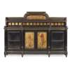 ebonised wood, with polychrome and gilt painted panels, gilded embellishments and glazed doors