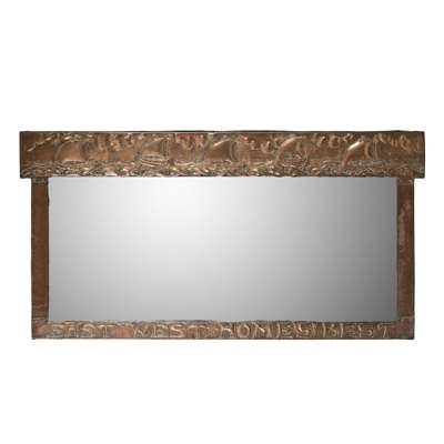 repoussé-decorated copper, mirror plate, decorated with galleons at sea and inscribed EAST WEST, HOME'S BEST