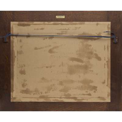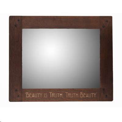 oak, with mirror plate, inlaid with inscription BEAUTY IS TRUTH, TRUTH BEAUTY, bears ivorine maker’s label LIBERTY & CO