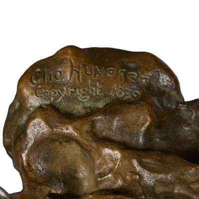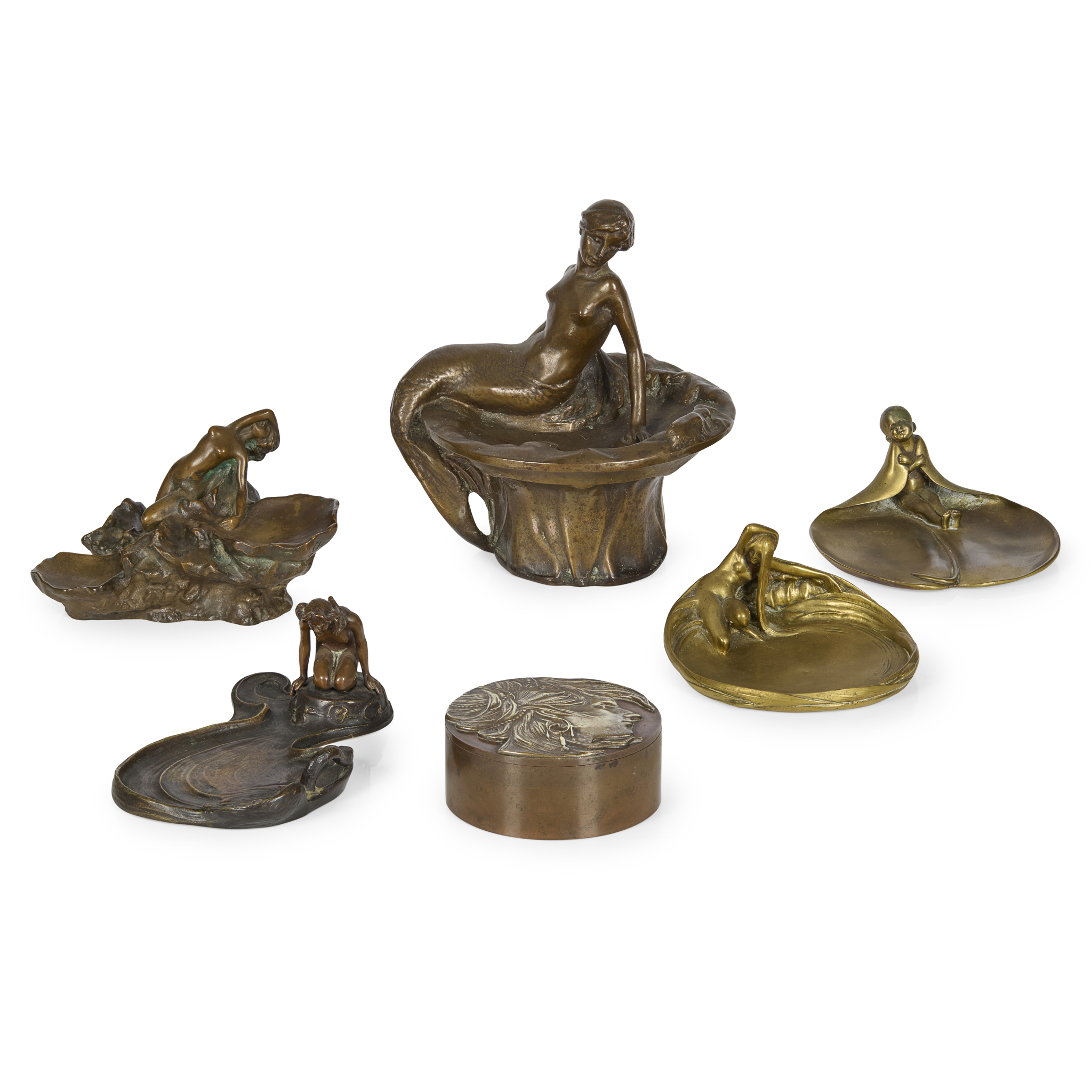 bronze, signed in the bronze CLIO HUNEKER/ COPYRIGHT/ 1899, with foundry mark THE HENRY BONNARD/BRONZE CO. N.Y./FOUNDERS, 14cm across; another ART NOUVEAU TRAY, BY ARTHUR RUBENSTEIN, bronze, indistinctly signed in the bronze, 11cm diameter; THREE FURTHER ART NOUVEAU FIGURAL BRONZE TRAYS, 16cm high, 12cm diameter, 16cm across; together with an ART NOUVEAU BOX & COVER, bronze, with cast brass, 9cm diameter (6)