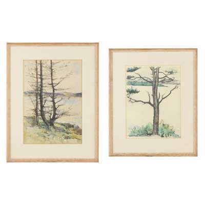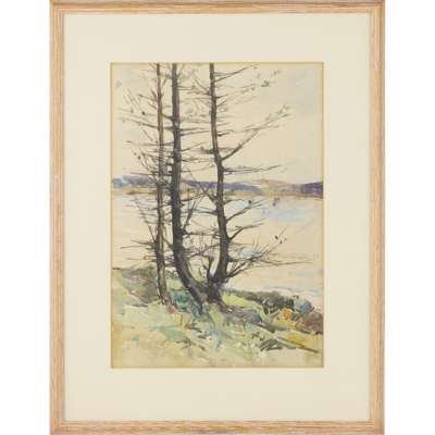 charcoal and watercolour, framed, 29cm x 22cm (frame size 44cm x 36cm); and another by the same hand ‘TREES BY THE RIVER’, charcoal and watercolour, framed 34cm x 23.5cm (frame size 49cm x 38cm) (2)