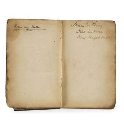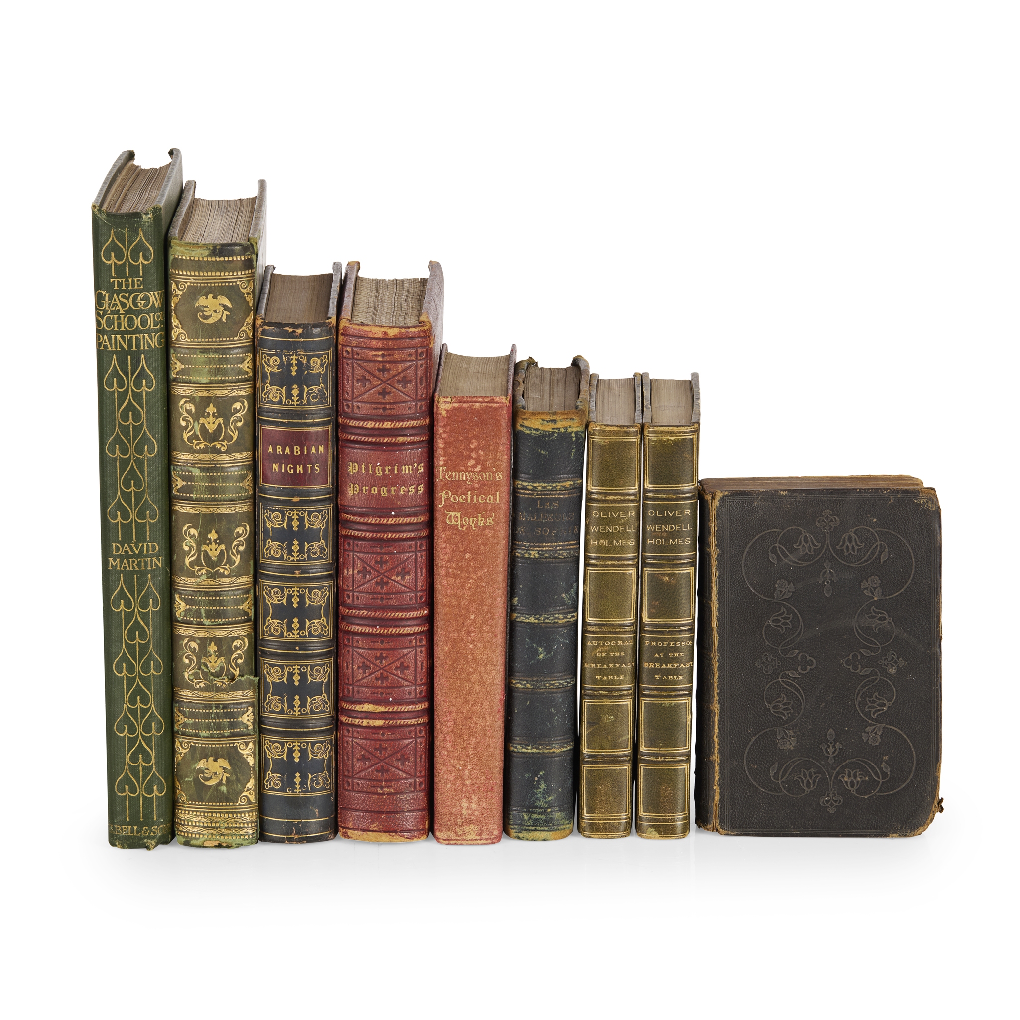 Greenaway, Kate. Kate Greenaway's Birthday Book, c.1920. 16mo, original cloth, inscribed ‘To Merle from Angus’ within hand-drawn decorative border on front free endpaper, with manuscript entries throughout, including for ‘Mrs E. A. Taylor’, i.e. Jessie M. King, next to her birthday of 20 March; Le Nouveau Testament. Strasbourg 1878, ownership inscription ‘Peggy King, The Manse, New Kilpatrick, April 1898’ to initial blank; The Letters of Charles Lamb. London: J.M. Dent & Co., with gif inscription 'To Mrs Taylor “A trifling memory of a true kindness” G.J.J. July 1917; Sappho. One Hundred Lyrics. London: Alexander Moring Limited, 1906. Small 8vo. contemporary green roan, gift inscription ‘To E.A.T. Xmas ’06'; and 22 others similar, from the library of Merle Taylor, several with family inscriptions, mainly leather-bound.