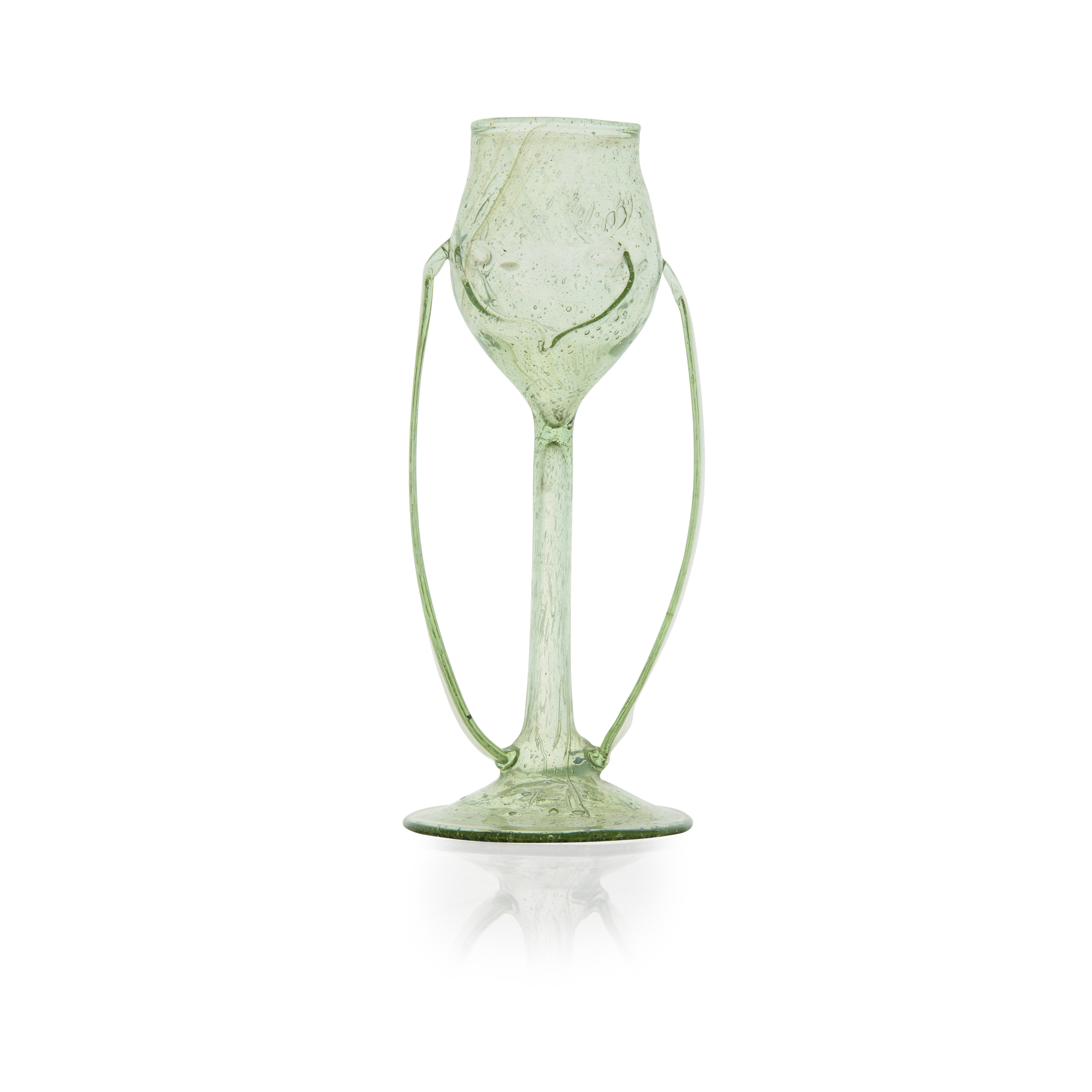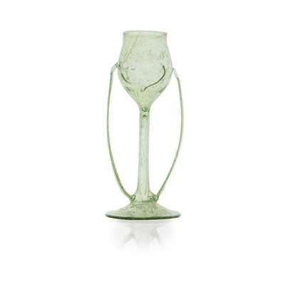 This rare liqueur glass, one of two known to exist in complete form, is mentioned in various contemporary publications including Dekorative Kunst in 1898 and Architectural Review in 1901 where they were also illustrated in a group of around 28. The earliest mention of the glasses can be found in an unpublished manuscript by the designer Talwin Morris where Morris expounds on the virtues of the Glasgow Four designers. In anticipation of publication he also alludes to the photograph of the glasses, intending to use it as one of the illustrations of his appreciation. He remarks on McNair's glass designs “The artist's need:- we might fittingly say passion - for expression has lately found vent in various, and beautiful, designs for glass-ware. Dainty, almost ethereal in design, while showing sufficiently the result needful in articles for practical use; these have been executed under their author's personal supervision; with the result that we may obtain a set, uniform in general plan, with each item of general interest; secured by intelligent application of detail, and freedom from mechanical texture. We reproduce here a little cluster of liqueur glass; the most recent result of this development.”